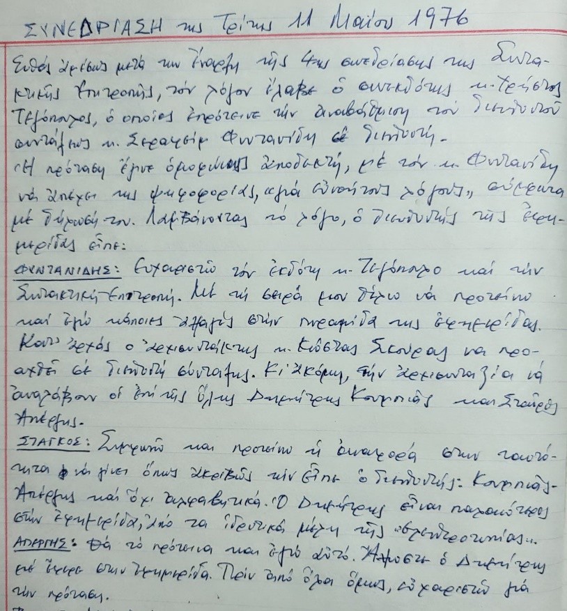 Για την Ιστορία, τα πρακτικά της συγκεκριμένης συνεδρίασης, με τις τέσσερις πρώτες παραγράφους τους στην εικόνα αριστερά: ΣΥΝΕΔΡΙΑΣΗ της Τρίτης 11 Μαΐου 1976 - Ευθύς αμέσως μετά την έναρξη της 4ης συνεδρίασης της Συντακτικής Επιτροπής, τον λόγον έλαβε ο συνεκδότης κ. Χρήστος Τεγόπουλος, ο οποίος επρότεινε την αναβάθμιση του διευθυντού συντάξεως κ. Σεραφείμ Φυντανίδη σε διευθυντή.