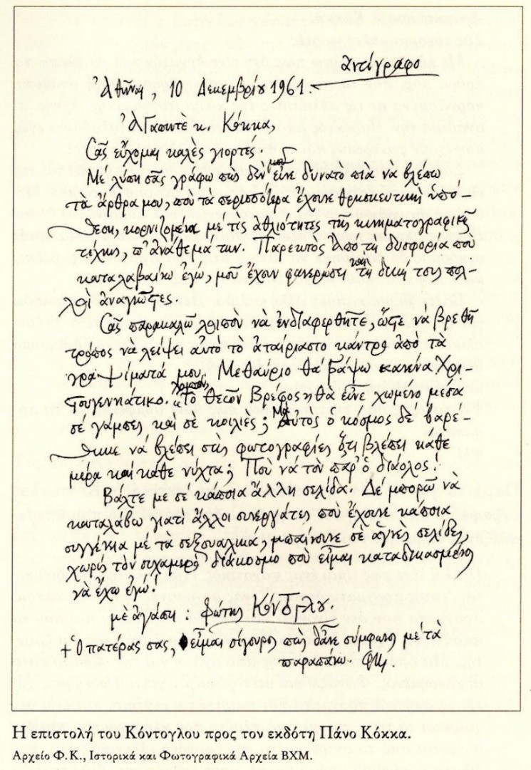 Το δεύτερο, δυο χρόνια αργότερα· μια ακόμη επιστολή διαμαρτυρίας προς Κόκκα. Αντιδρώντας σε υπόδειξη για τη θεματολογία των κειμένων του, έγραφε: … τηλεφώνησε στο σπίτι μου, για να πει όμως πως αυτά τα θαύματα της Θέρμης που γράφω δεν τα θέλει ο κόσμος και συστήνοντάς μου να γράφω καραβίσιες ιστορίες. Να, που στα γεράματα αξιώθηκα να παίρνω και οδηγίες τι θα γράψω και πώς θα το γράψω. Καλό λοιπόν θα’ ναι να σας θυμίσω, πως ονομάζομαι Φώτης Κόντογλου, πως έγραφα είκοσι χρονών τον «Πέδρο Καζάς», πως η πέννα τούτη έκανε τον Καζαντζάκη, που τον αποθεώνει κάθε τόσο η Ελευθερία, να την ονομάσει «αθάνατη». Οικόσημα τέτοια δεν ζήτησα ποτές κι ούτε τα έδειξα, μα σας τα θυμίζω, αφού τα ξεχάσατε σε τέτοιο σημείο, ώστε να μη βγάζετε κανέναν άλλο μεγαλοφυά συνεργάτη σας για να βάλετε τι κυριακάτικες ρεκλάμες σας, αλλά μονάχα εμένα. Με κομματιάσατε, με πληγώσατε, σαν να’ γραφα την «Ωραίαν τον Πέραν». Ντροπή κ. Κόκκα.